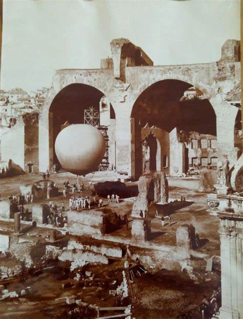 Un personaggio che svolse un ruolo importante nello sviluppo delle tecniche di ripresa aerea fotografica fu l’architetto e archeologo veneziano Giacomo Boni (1859-1925). Recentemente a Roma è stata realizzata un’importante mostra, alla quale ha partecipato anche la società Aeronord di Milano di Enzo e Claudia Cisaro, installando un pallone vincolato che ha rievocato le tecniche utilizzate dal Boni nella prospezione del Foro Romano. È infatti a Boni che si deve l’intuizione delle potenzialità che avrebbero potuto esprimere le tecniche di rilevamento aereo messe a punto, a partire dal 1885, dalla Sezione Aerostatica del Terzo Reggimento del Genio Militare, se applicate alla documentazione delle indagini archeologiche. Come ribadito dagli autori della mostra “cultore della fotografia, convinto assertore della sua utilità per documentare ogni aspetto delle ricerche condotte sul campo, Boni trovò un degno termine di confronto nell’allora capitano dell’Esercito Maurizio Mario Moris, personaggio innovatore destinato a rivestire un ruolo di primo piano nel panorama aeronautico militare italiano: comandante dal 1892 della Brigata Specialisti, in seno alla quale si era sviluppata la sezione Aerostatica, fondò, nel 1896, la Sezione Fotografica, con l’intento di sviluppare la fotografia aerea da pallone. Tenendo conto di queste inclinazioni, l’incontro tra i due e la nascita di una salda collaborazione tra la Direzione Generale delle Antichità e Belle Arti del Ministero della Pubblica Istruzione e il Genio Militare appare ai nostri occhi come un esito naturale. I punti di forza di questo sodalizio furono molteplici: il Foro Romano costituiva un campo di esercitazione particolarmente complesso, adatto all’affinamento delle tecniche di documentazione grafica e fotografica; al contempo, le analisi archeologiche potevano arricchirsi di una documentazione di qualità eccezionale, essendo corredate, a partire dalla primavera del 1899, di fotografie aeree riprese dal pallone aerostatico. La completa condivisione di intenti tra il Boni e il Moris diede risultati durevoli: dietro le esercitazioni nella laguna Veneta, 10 anni più tardi, così come sul suolo libico, all’indomani del conflitto italo-turco, dobbiamo scorgere il consiglio, se non la presenza stessa dell’architetto veneto; dietro alcune donazioni per la prosecuzione delle ricerche nel Foro, così come nel rilievo fotografico degli affreschi portati in luce nella chiesa di S. Maria Antiqua, riconosciamo senza dubbio l’impegno e la mano del generale Moris. Dante Vaglieri, che con Boni seguì gli scavi sul Palatino, il tenente Attilio Ranza e il capitano Cesare Tardivo, autori di due manuali per la realizzazione di rilievi fotografici aerei, furono i primi consapevoli custodi di questa lezione, essendo, in più occasioni, capaci non solo di applicarla ma anche di innovarla, continuando a illustrare le enormi potenzialità raggiunte dall’applicazione in campo civile di tecniche messe a punto in ambito militare”.