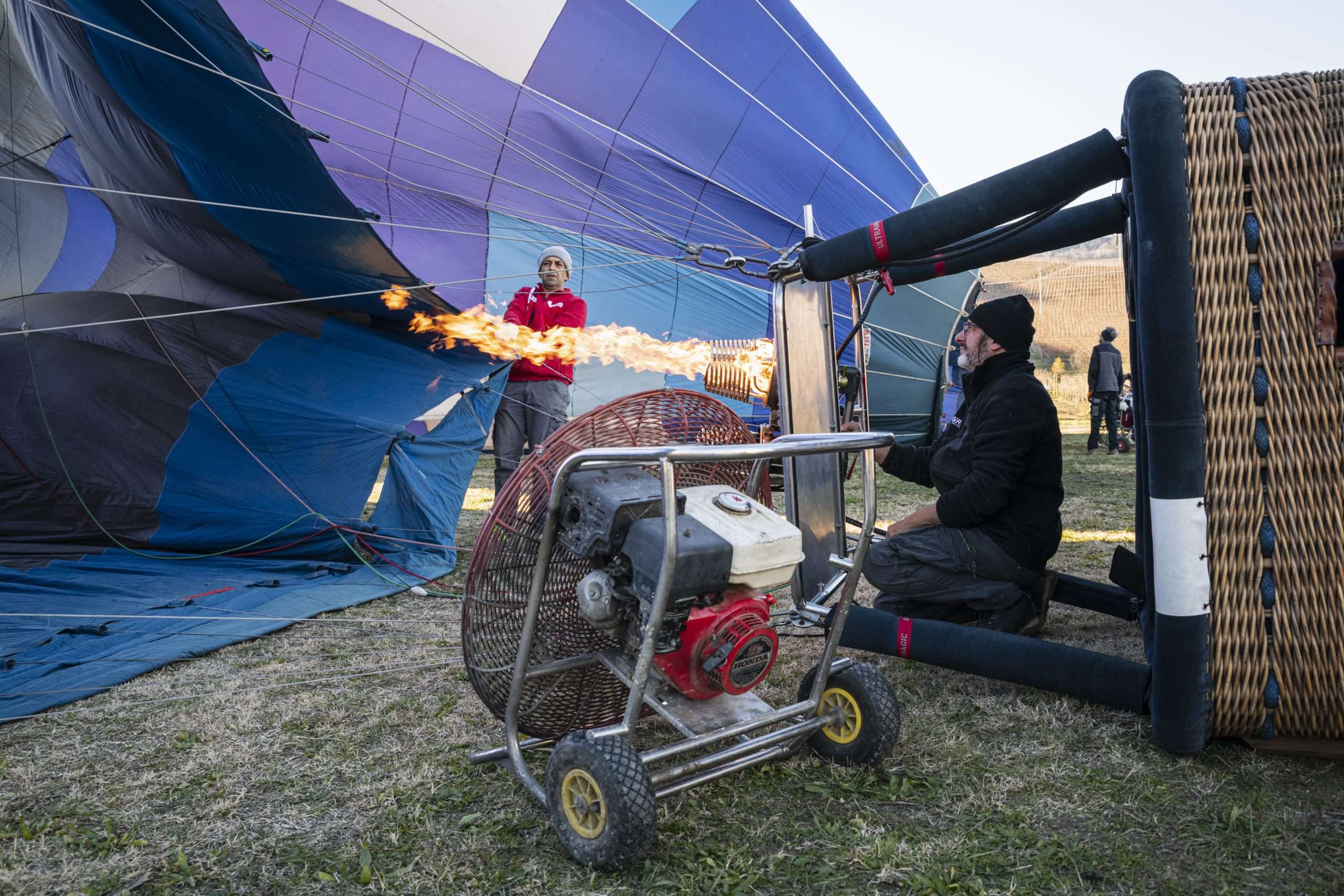 Bisogna fare con calma quando fa così freddo; bisogna dare il tempo all’aria del ventilatore di entrare, di riempire bene tutto il pallone, sennò c’è il rischio che vada su sgonfio; e questo non va bene, si rischia di bruciare la bocca…