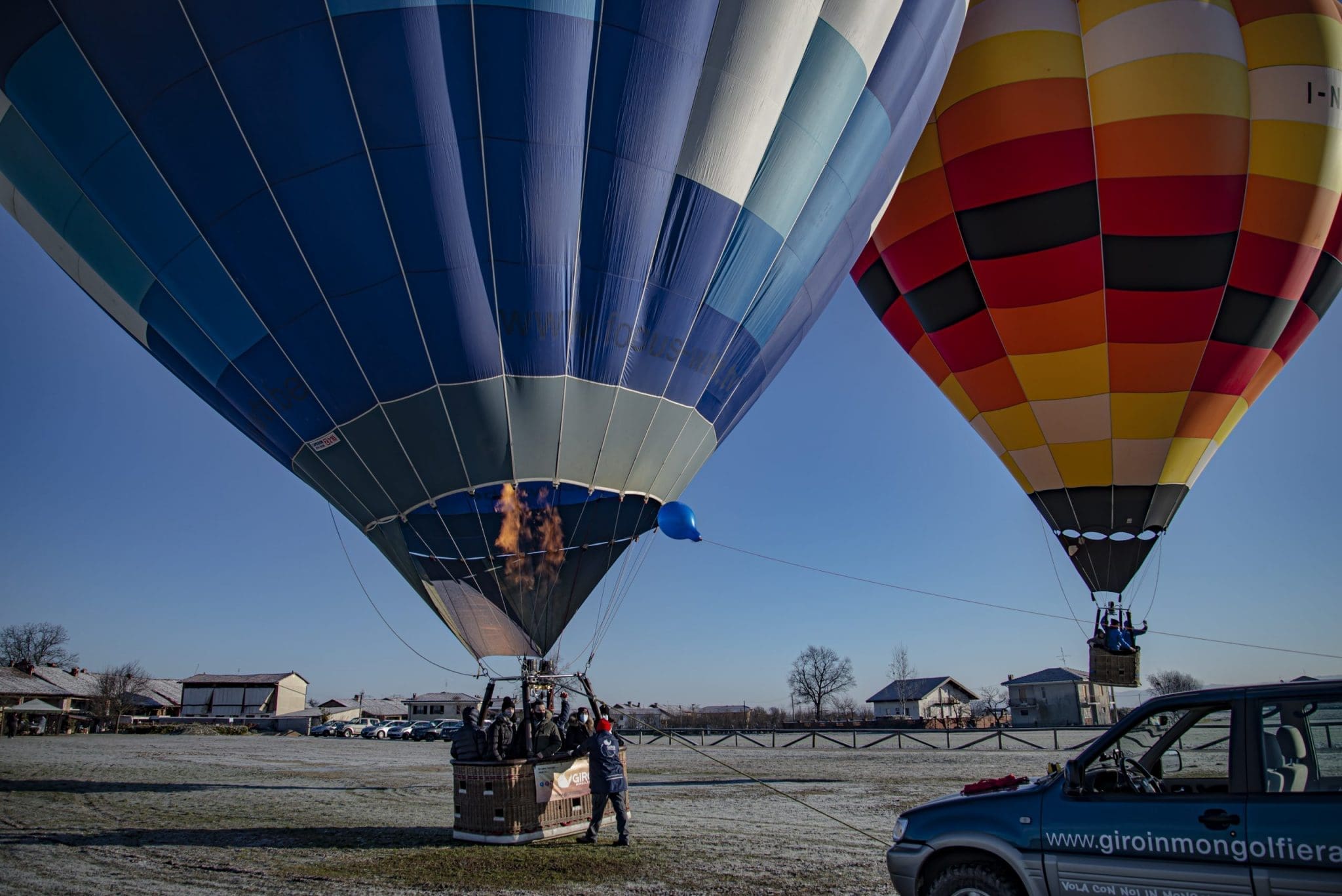 Fa talmente freddo che l’erba scricchiola sotto i piedi. Gonfiamo un palloncino per vedere la direzione del vento; è normale, si va verso Nord, verso Bene Vagienna.