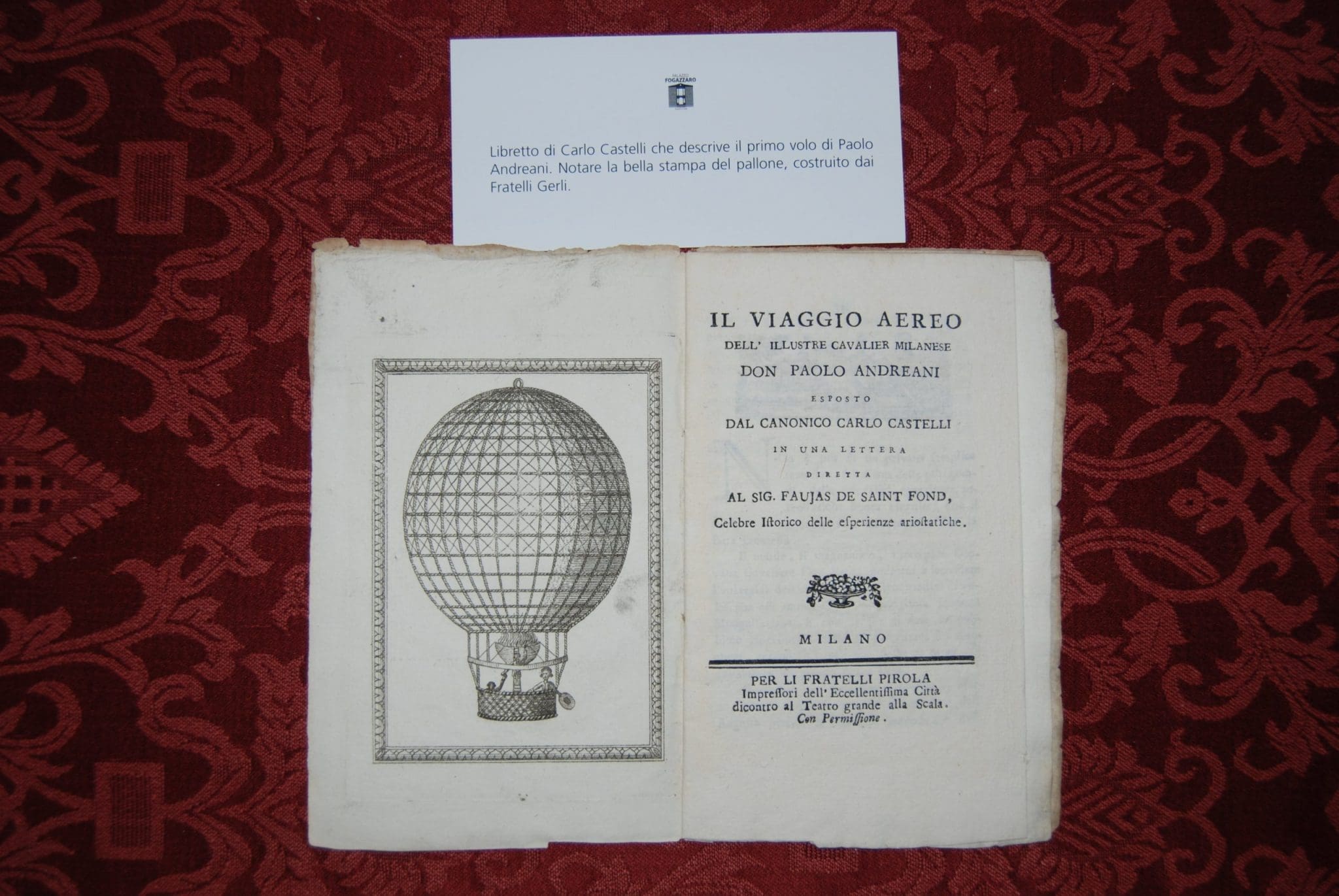 Un’altra tipologia di collezione collegata all’aerostatica è quella dei libri che ne parlano. Come già abbiamo accennato, soprattutto alla fine del Settecento, la “nuova arte” riscuoteva grande interesse ed era molto seguita dai “media” dell’epoca. Sono quindi moltissime le opere di quei tempi, alcune di ottima fattura, come i famosi “Opuscoli” dei fratelli Gerli, editi a Parma nel 1785 con i tipi del Bodoni, famoso tipografo e stampatore di quel tempo. Un altro volumetto ricercatissimo è rappresentato dal “Giornale Aerostatico”, considerato il primo periodico mondiale di aeronautica, pubblicato a Milano già nel gennaio 1784 e chiuso solo tre mesi dopo per ordine delle autorità che lo ritenevano potenzialmente sovversivo. Oltre a questi due piccoli capolavori editoriali, non possiamo non citare altre opere di grande pregio e valore scientifico, come ad esempio il “Prodromo all’arte maestra” di Padre Francesco Lana Terzi, pubblicato a Brescia nel lontano 1670. In esso l’autore ipotizzava la creazione di una “nave volante” che sarebbe stata in grado di volare. Peccato che la tecnologia dell’epoca non avrebbe mai potuto realizzarla. Molto ricercate anche tutte le numerose versioni dell’opera dello scienziato e storico francese Barthélemy Faujas de Saint Fond, che descrisse minuziosamente il primissimo volo realizzato a Parigi il 21 novembre 1783 dai fratelli Montgolfier con i due aeronauti Pilâtre de Rozier e François Laurent d’Arlandes. A fine Settecento questo volume fu tradotto in moltissime lingue e divenne un “best seller”, tanto è vero che ne furono realizzate anche copie “pirata” in Italia e in altri Paesi.