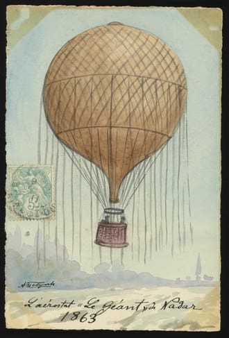 Già attorno al 1858, Félix Tournachon (1820-1910), illustre fotografo e aeronauta parigino, meglio noto come Nadar, effettuò i primi esperimenti fotografici scattando immagini da bordo di un pallone a gas, ma senza esito. Le ragioni del fallimento erano dovute soprattutto al fatto che il gas, fuoriuscendo dalla base dell’involucro con sbuffi di idrogeno solforato, alterava le delicate reazioni chimiche necessarie per lo sviluppo delle lastre. Per questo motivo, Nadar costruì un pallone gigantesco, chiamato per l’appunto “Le Géant”, con una navicella che di fatto era una vera e propria casetta a due piani, sistemando al suo interno una piccola “camera oscura” volante. Fu così che il grande fotografo, all’epoca molto noto e quotato a Parigi, riuscì a realizzare le prime immagini aerofotografiche, sia pure ancora piuttosto mosse e sfuocate.