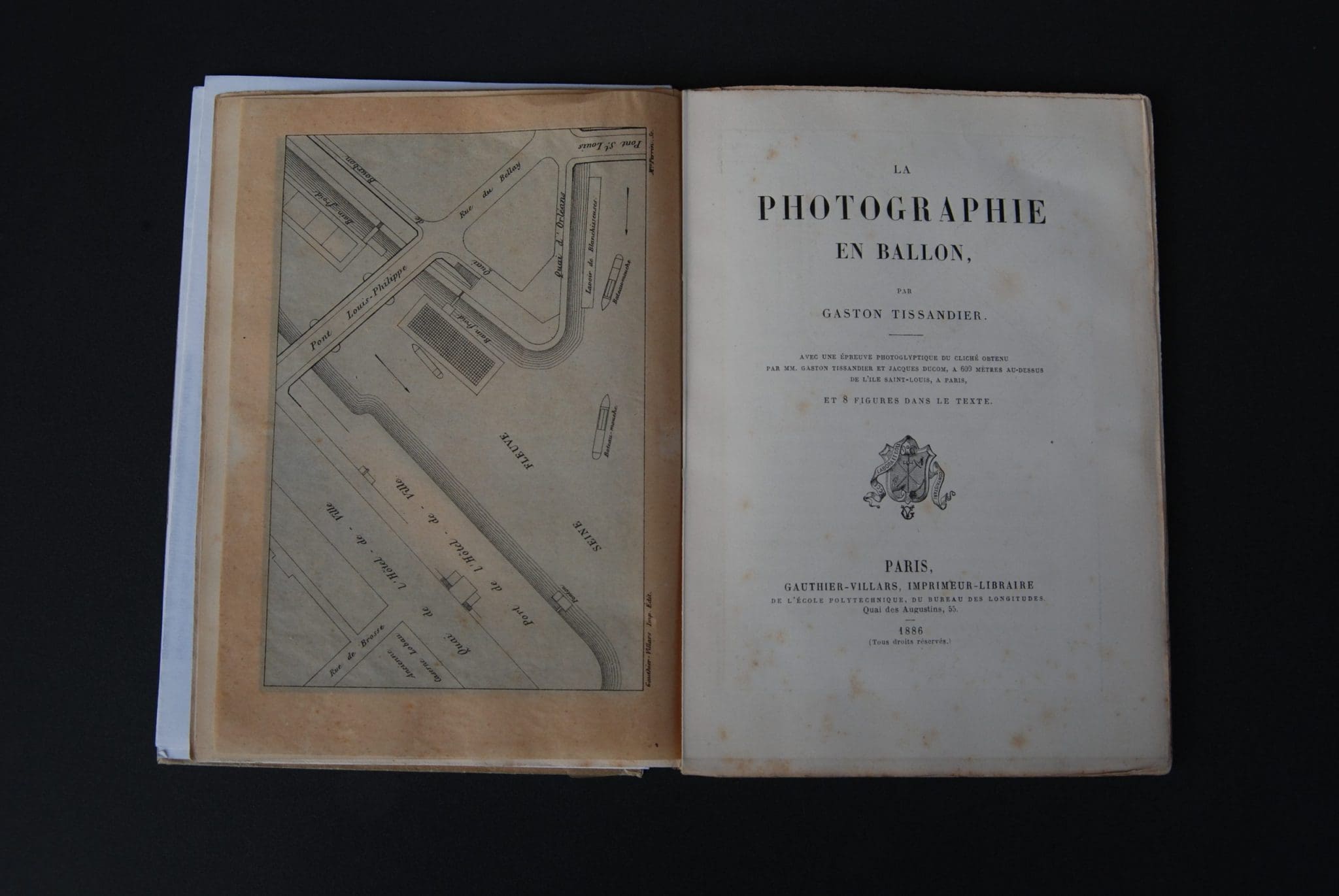 Bisogna però attendere fino al 1886 per veder apparire il primo testo dedicato all’argomento. Si tratta di “La photographie en ballon” scritto ancora da un aeronauta e scienziato francese, Gaston Tissandier. Nel frontespizio di questo raro volumetto è riportata una copia originale di una delle primissime fotografie di buona qualità scattate da Nadar: si tratta di una veduta della Senna con il ponte Louis Philippe, realizzata a bordo del grande pallone vincolato di Henri Giffard, installato all’Ippodromo nel 1868, un aerostato che riusciva a salire fino ad oltre 200 metri di altezza.