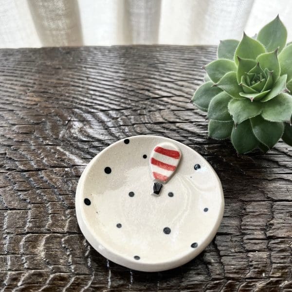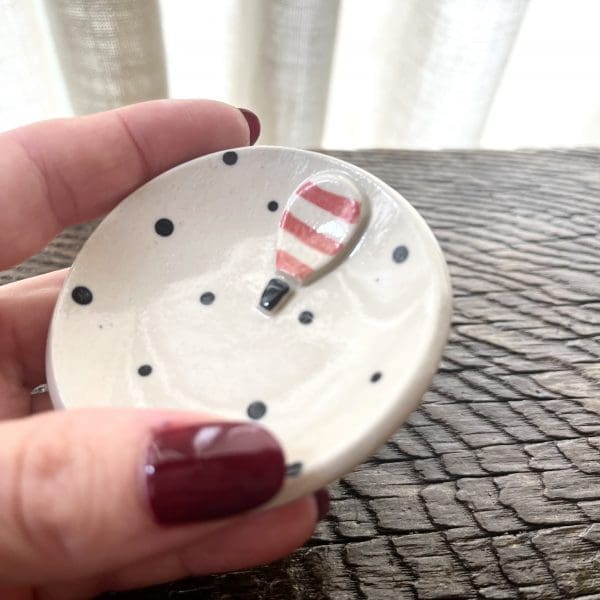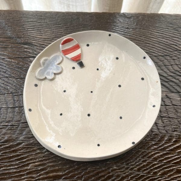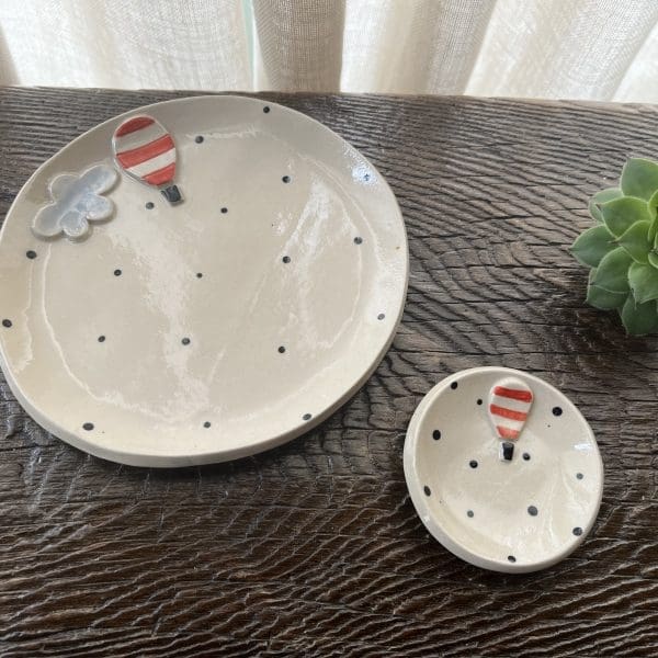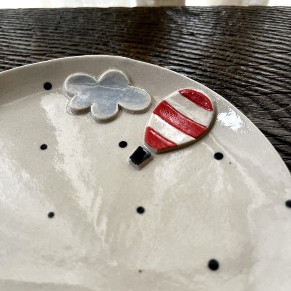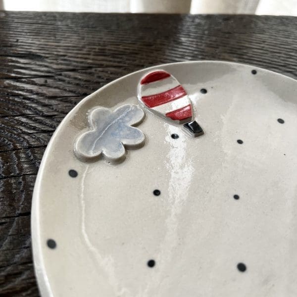 Piattino realizzato in ceramica decorata con la mongolfiera e la nuvoletta in porcellana ma colorata nell’impasto, e infine rifinito con cristallina apiombica trasparente.