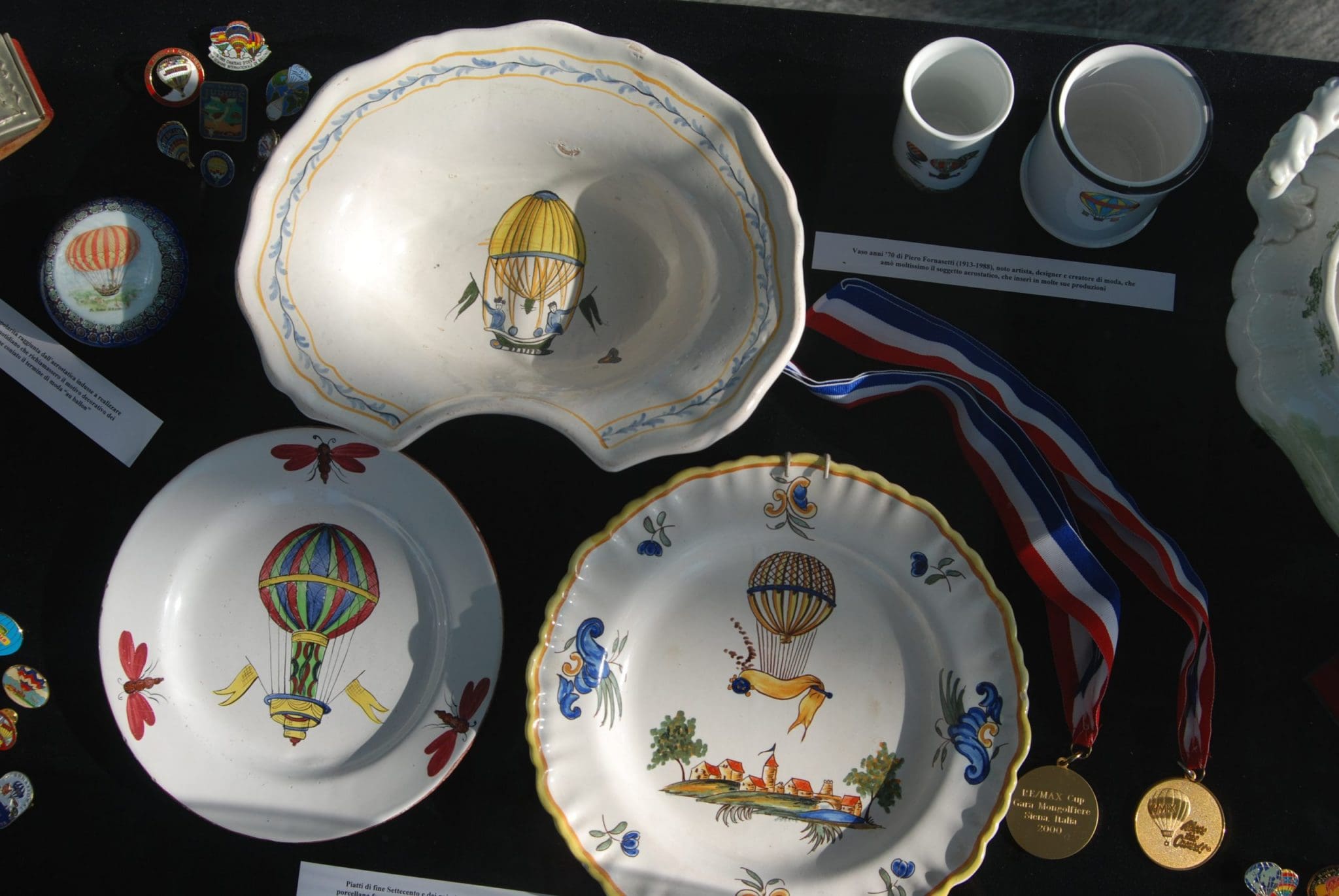 ” Il collezionismo sul tema non ha comunque limiti: è possibile anche ricercare oggetti ispirati alle mongolfiere e agli “sferici”. Tessuti, vestiti, cravatte, foulard, complementi d’arredo, stoviglie, suppellettili, vasi, orologi da tavolo e da polso, tabacchiere, bottiglie di cristallo, fotografie d’epoca, strumenti di volo, manifesti che possono andare a completare una raccolta di grande fascino. Non è facilissimo trovare oggetti autentici d’epoca, ma ci si può anche limitare ad oggetti moderni ispirati al tema. Bellissimi e molto raffinati i piatti e le suppellettili create dal designer milanese Piero Fornasetti (1913-1988)”.
