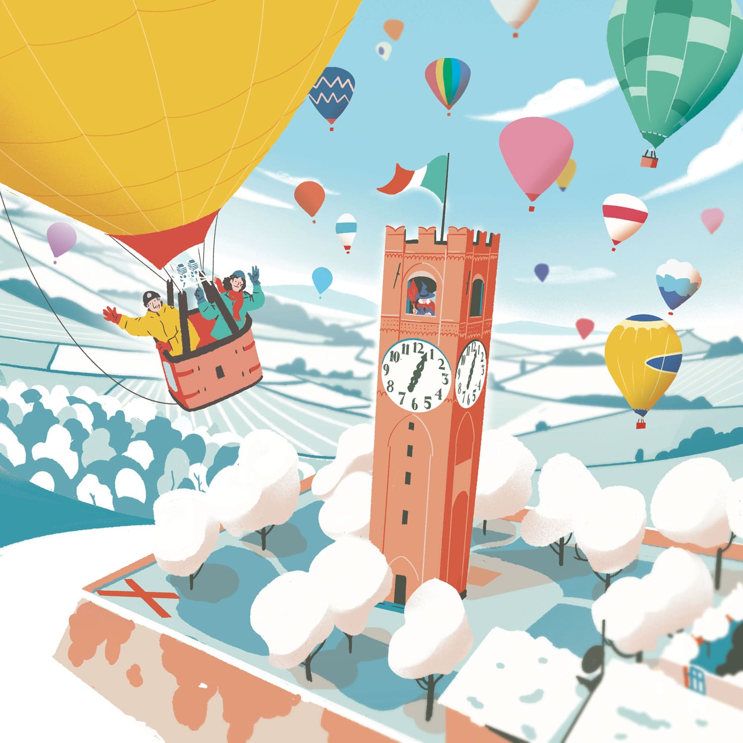 La cartolina di sinistra è stata realizzata in occasione del 33° Raduno di Mongolfiere di Mondovì da Giovanni Gastaldi, un giovane illustratore Monregalese!