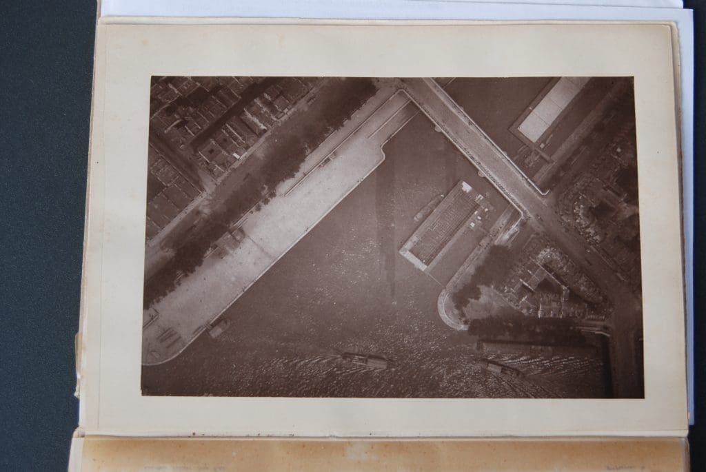 Bisogna però attendere fino al 1886 per veder apparire il primo testo dedicato all’argomento. Si tratta di “La photographie en ballon” scritto ancora da un aeronauta e scienziato francese, Gaston Tissandier. Nel frontespizio di questo raro volumetto è riportata una copia originale di una delle primissime fotografie di buona qualità scattate da Nadar: si tratta di una veduta della Senna con il ponte Louis Philippe, realizzata a bordo del grande pallone vincolato di Henri Giffard, installato all’Ippodromo nel 1868, un aerostato che riusciva a salire fino ad oltre 200 metri di altezza.