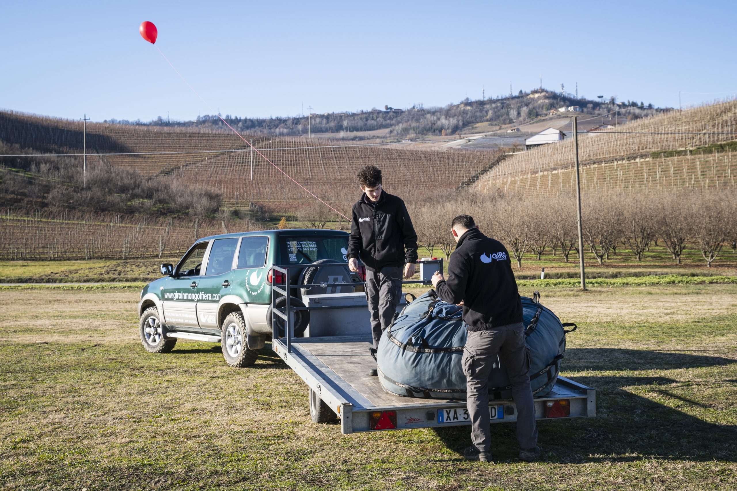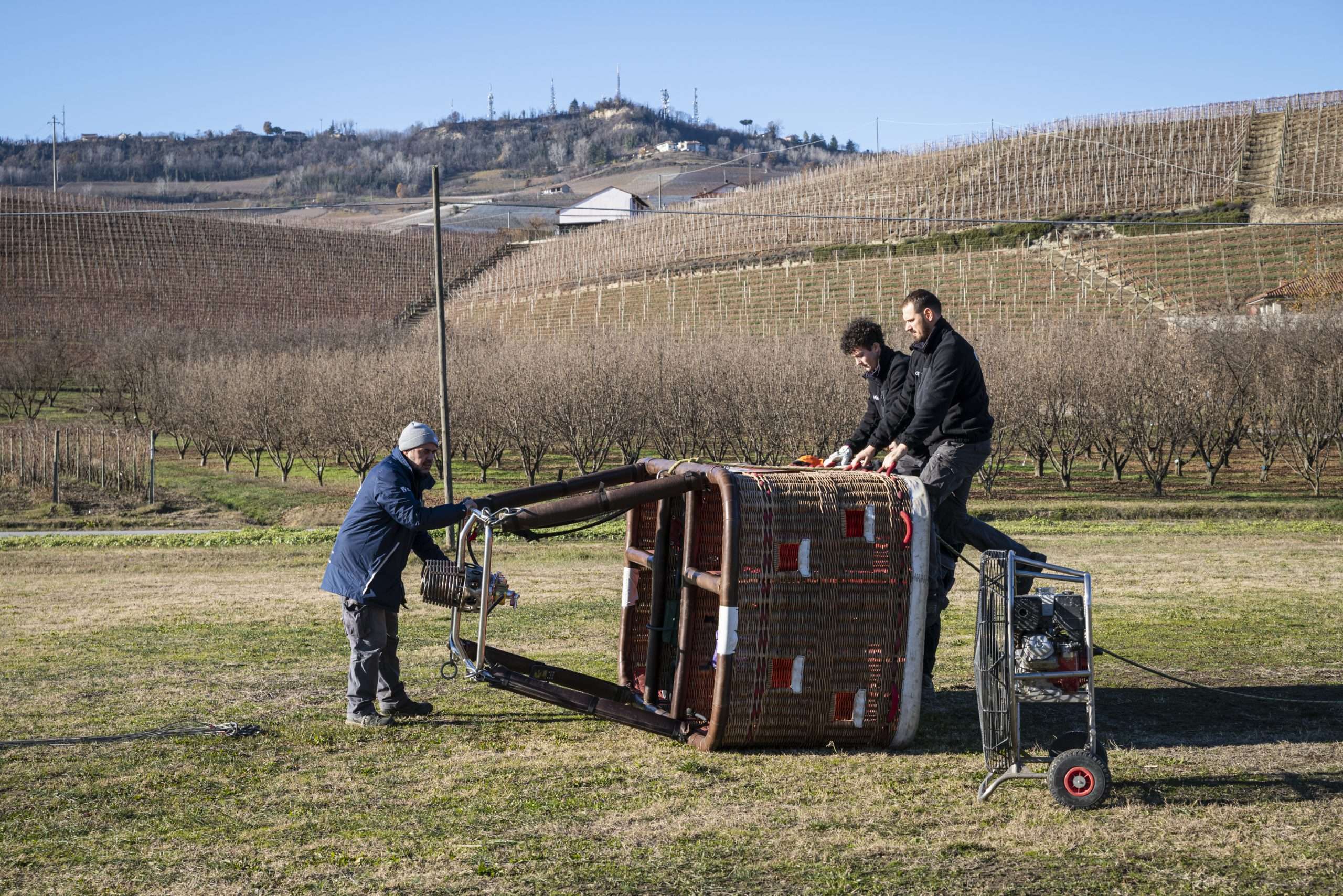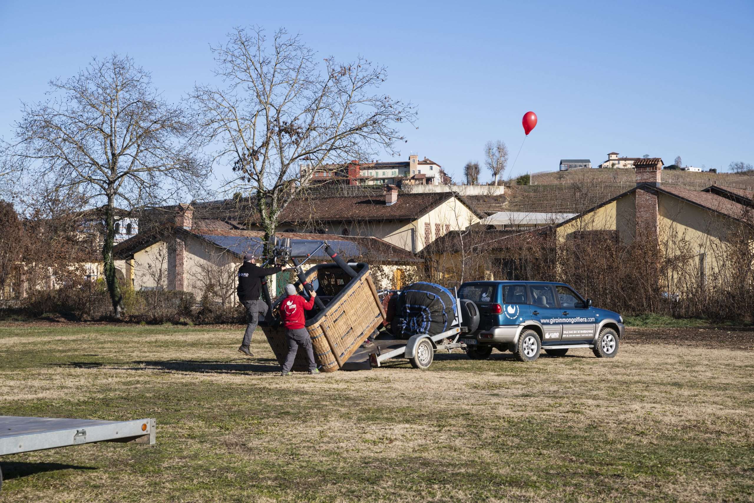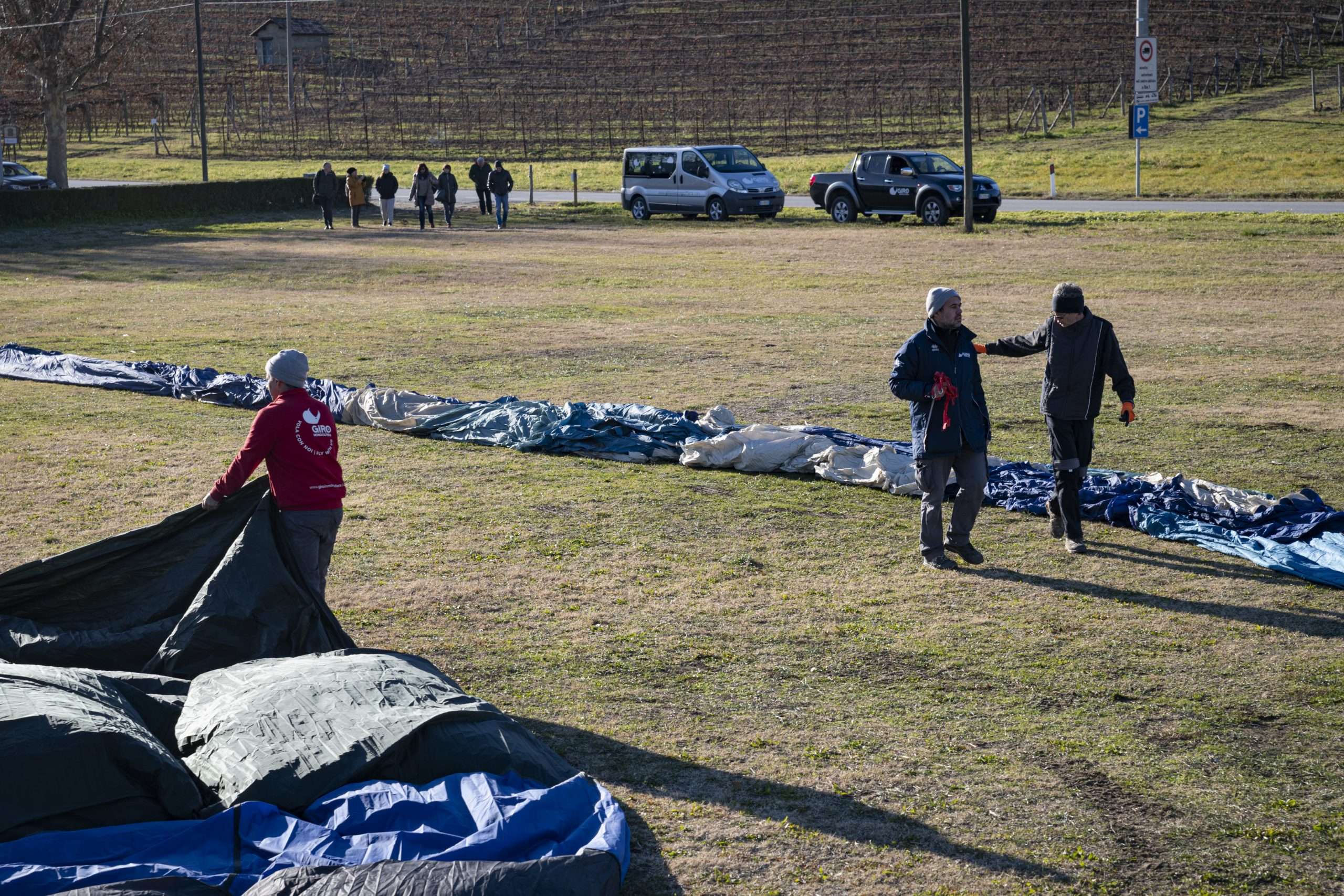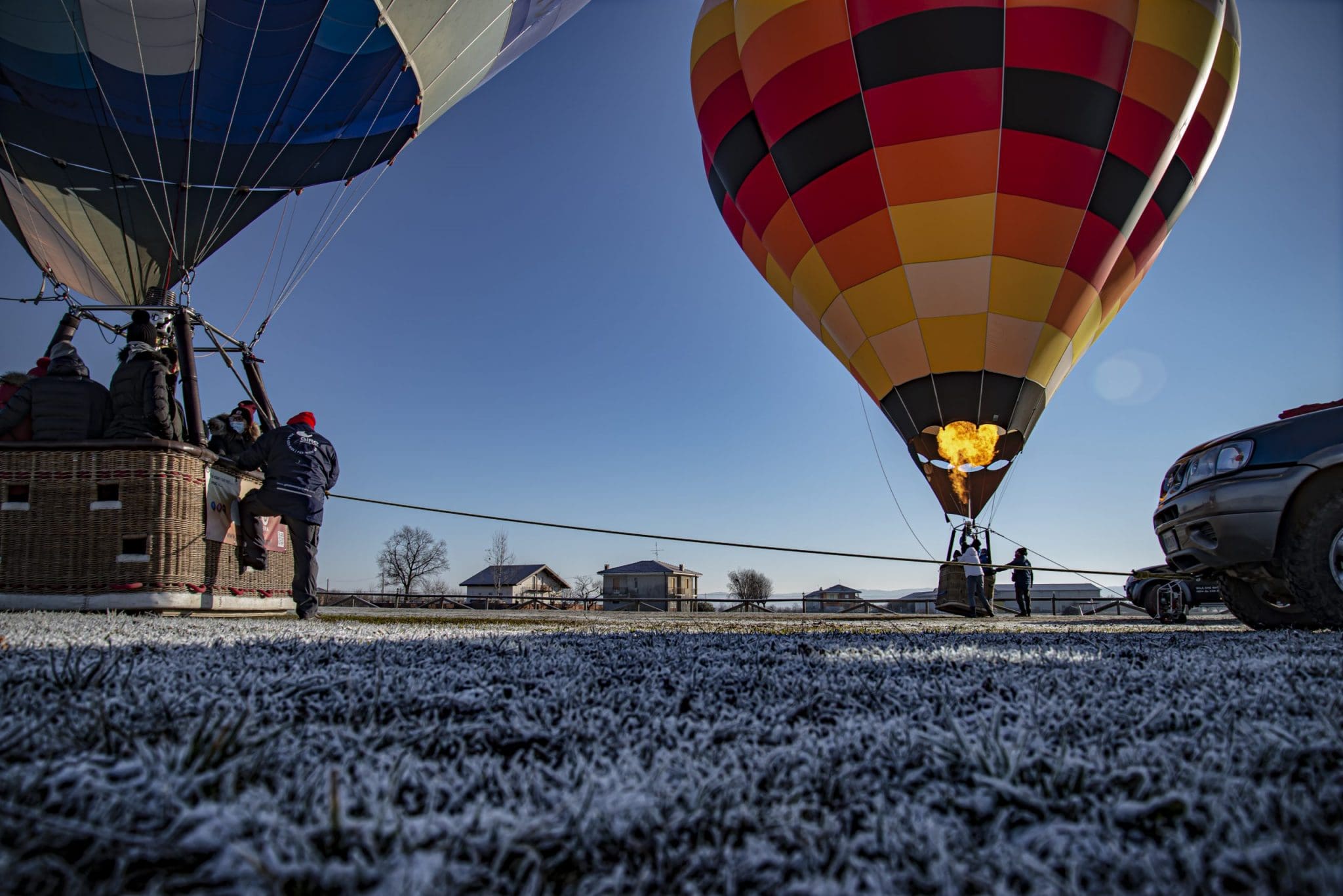 Fa talmente freddo che l’erba scricchiola sotto i piedi. Gonfiamo un palloncino per vedere la direzione del vento; è normale, si va verso Nord, verso Bene Vagienna.