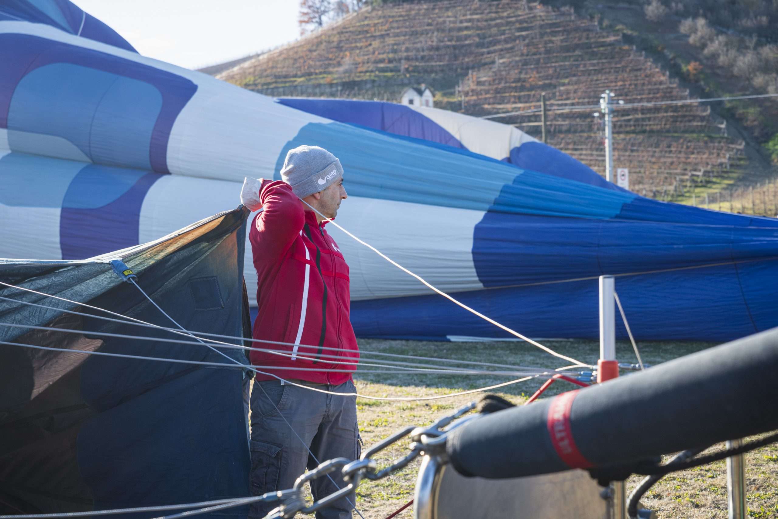 Bisogna fare con calma quando fa così freddo; bisogna dare il tempo all’aria del ventilatore di entrare, di riempire bene tutto il pallone, sennò c’è il rischio che vada su sgonfio; e questo non va bene, si rischia di bruciare la bocca…