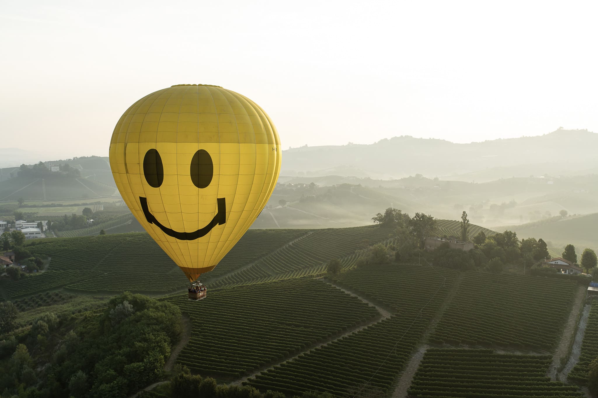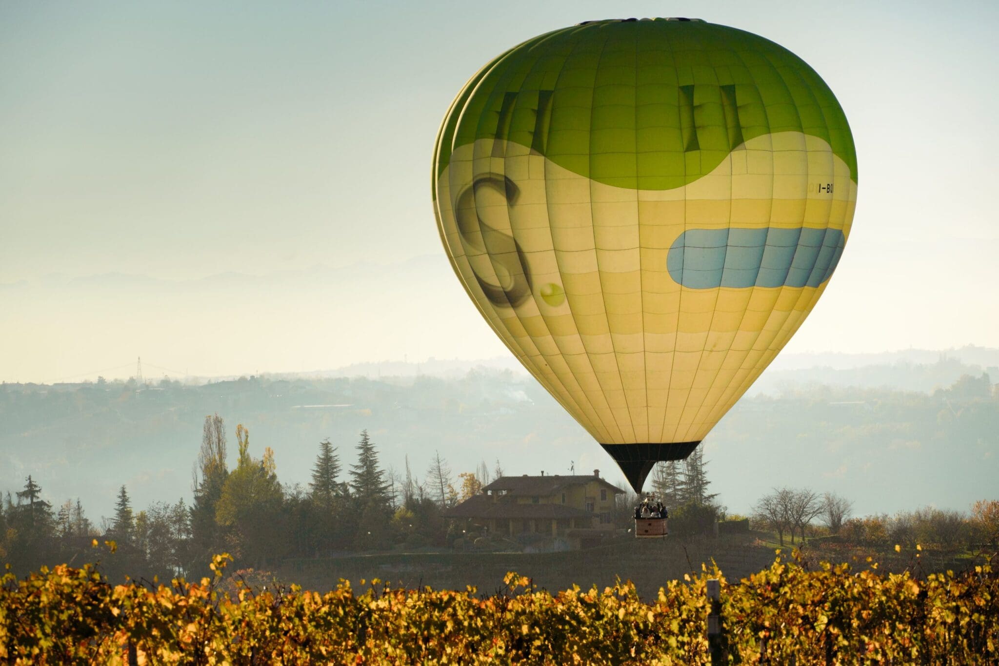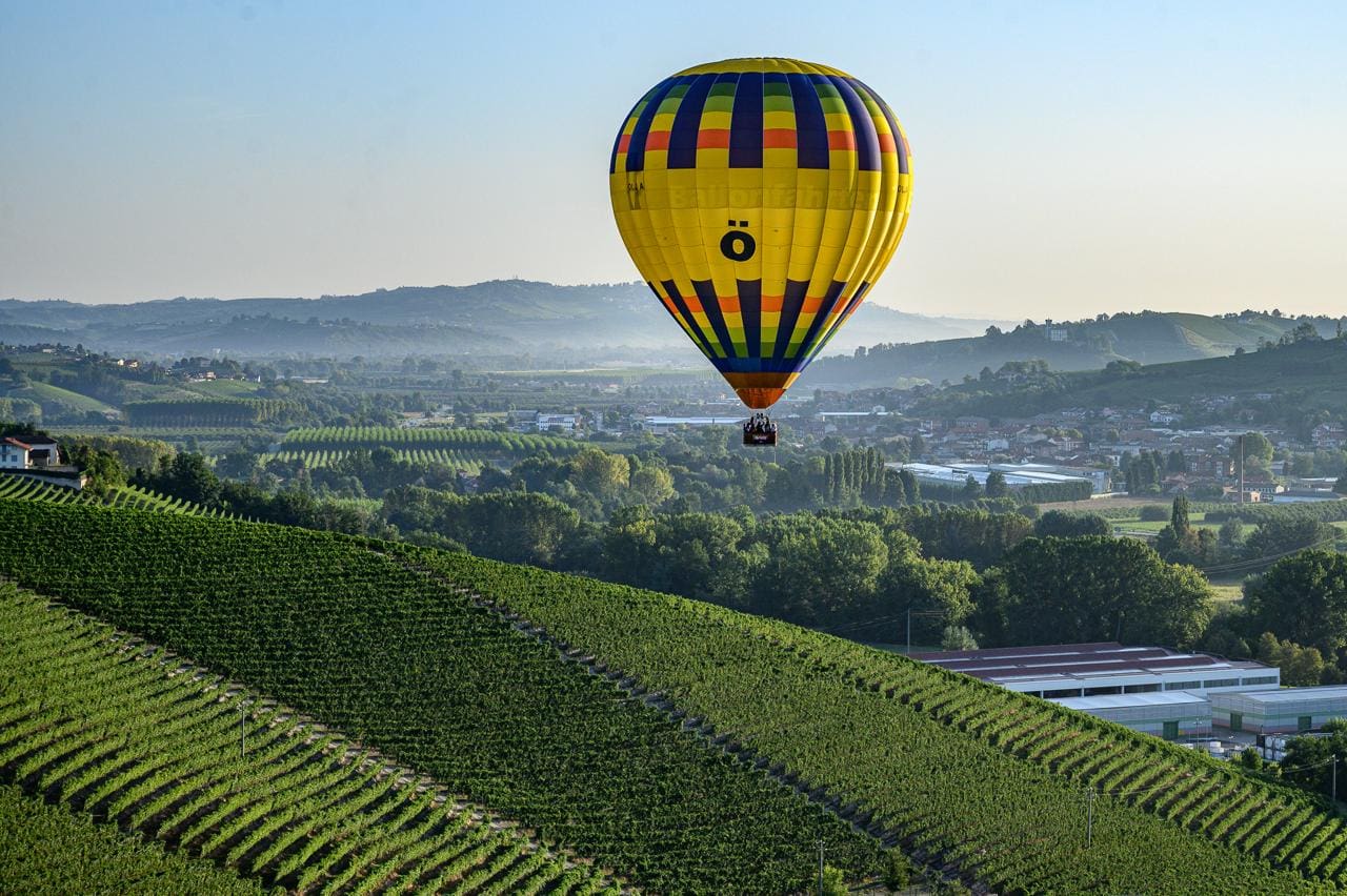 Una mongolfiera gialla vola sui vigneti delle Langhe